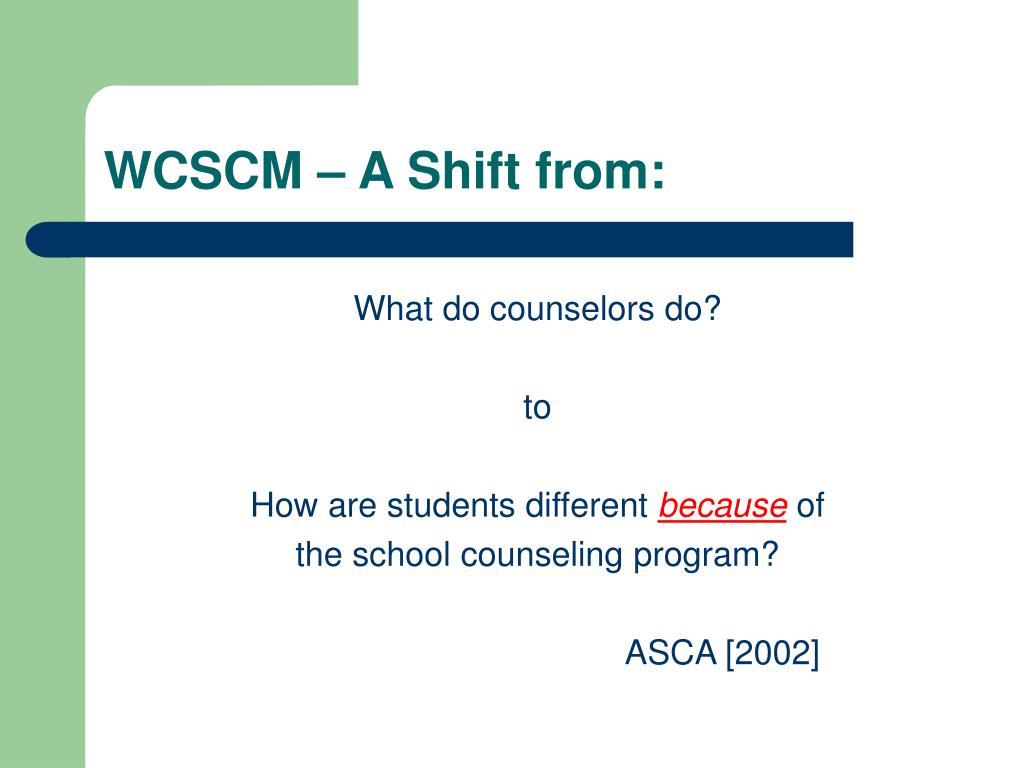 WCSCM – A Shift from: What do counselors do? to How are students different because of the school counseling program? ASCA [2002]