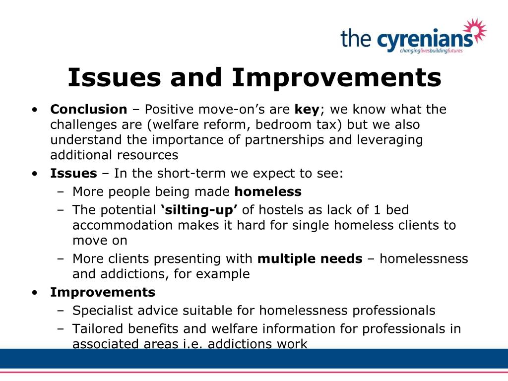Issues and Improvements • Conclusion – Positive move-on’s are key; we know what the challenges are (welfare reform, bedroom tax) but we also understand the importance of partnerships and leveraging additional resources • Issues – In the short-term we expect to see: • More people being made homeless • The potential ‘silting-up’ of hostels as lack of 1 bed accommodation makes it hard for single homeless clients to move on • More clients presenting with multiple needs – homelessness and addictions, for example • Improvements • Specialist advice suitable for homelessness professionals • Tailored benefits and welfare information for professionals in associated areas i.e. addictions work