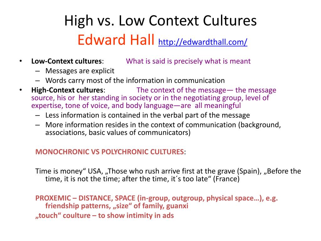High vs. Low Context CulturesEdward Hallhttp://edwardthall.com/ • Low-Context cultures: What is said is precisely what is meant • Messages are explicit • Words carry most of the information in communication • High-Context cultures: The context of the message— the message source, his or her standing in society or in the negotiating group, level of expertise, tone of voice, and body language—are all meaningful • Less information is contained in the verbal part of the message • More information resides in the context of communication (background, associations, basic values of communicators) MONOCHRONIC VS POLYCHRONIC CULTURES: Timeis money“ USA, „Thosewhorusharrivefirstatthegrave (Spain), „Beforethetime, itis not thetime; afterthetime, it´s toolate“ (France) PROXEMIC – DISTANCE, SPACE (in-group, outgroup, physicalspace…), e.g. friendshippatterns, „size“ offamily, guanxi „touch“ coulture – to show intimity in ads