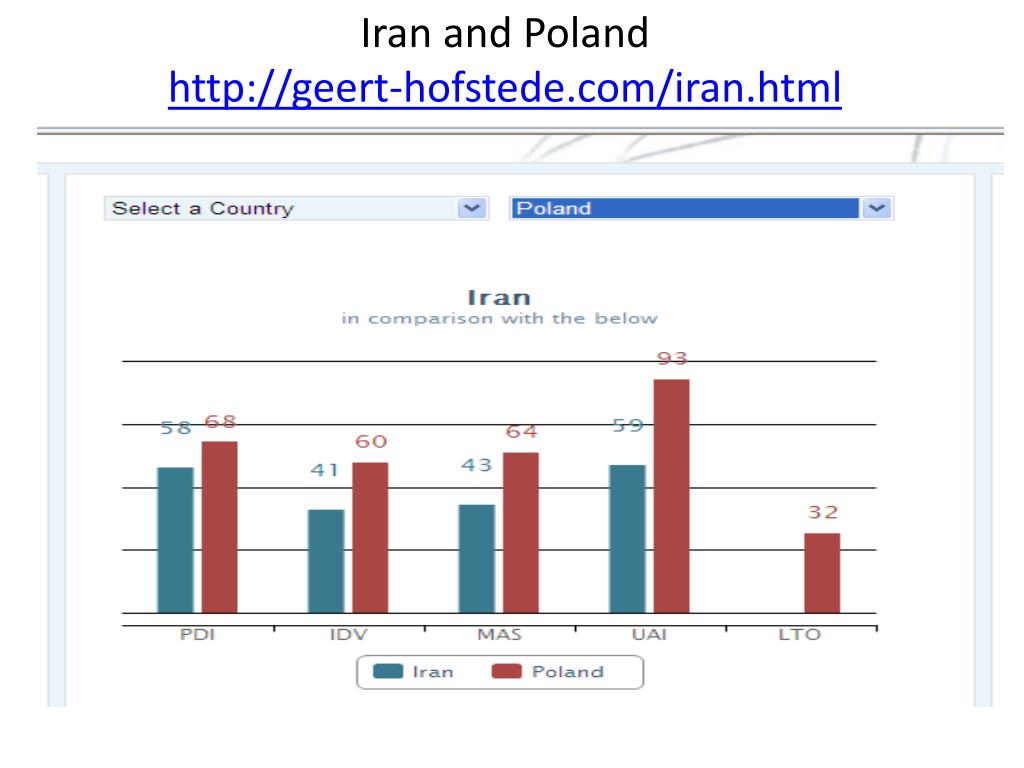 Hofstede • Power Distance (PDI) • Individualismversus collectivism (IDV) • Masculinityversus femininity (MAS) • Uncertaintyavoidance (UAI) • Long-term versus short-term orientation (LTO) • Indulgenceversus Restraint (IVR) • http://www.youtube.com/watch?v=PVbkjobD8ao&lr=1&feature=mhsn