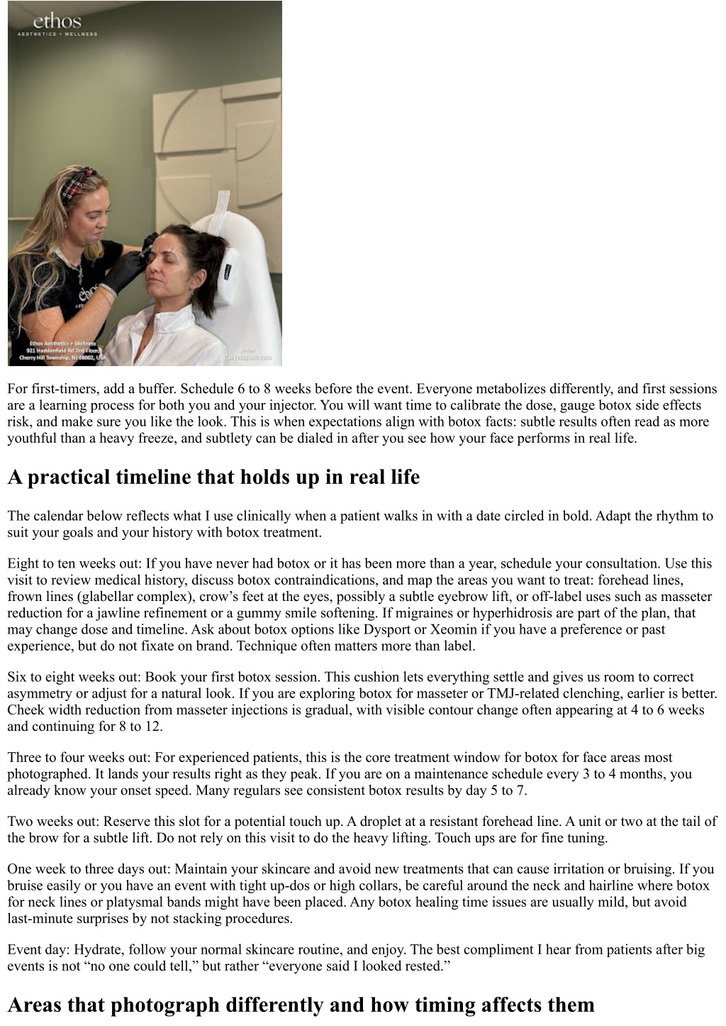 There are alternatives to botox like Dysport and Xeomin, and each has fans. Differences in onset and diffusion are small in skilled hands. Topical “botox alternatives” without needles can hydrate and mildly tighten, but they do not mimic the neuromodulator mechanism. Collagen stimulators and energy‑based devices play different roles. For etched lines at rest, think of light resurfacing or a touch of filler rather than more botox. If you are deciding between botox vs fillers for a specific concern, ask for a plan that addresses both cause and effect: movement creates lines, volume loss deepens them. When the stakes are higher than aesthetics Botox’s medical use includes migraine prevention and treating excessive sweating, known as hyperhidrosis. If your event involves long hours under lights in formalwear, reducing sweating in the underarms can be game changing. Timing is similar to facial botox but allow 2 to 4 weeks for full effect. For migraines, dosing and mapping are different, and you should coordinate with a specialist. The benefit curve often strengthens after multiple sessions, so this is not a last‑minute strategy. Choosing a provider and preparing with purpose Experience shows in the questions your provider asks and the restraint they show. A good botox specialist will study your face while you talk, watch how your brows rise, how your eyes crinkle when you smile, and what happens when you whisper a few test words. The consultation should cover botox risks, benefits, precautions, and a realistic botox timeline that includes a touch‑up window. If you feel rushed or sold to, keep looking. The stakes for your event deserve a measured approach. Below is a tight, high‑value checklist you can use when booking for a milestone date. Confirm your event date, then work backward to schedule treatment 4 to 6 weeks prior, longer if first‑time or masseter is included. Hold a touch‑up slot 2 weeks after the initial session and avoid major new treatments in the final 2 weeks. Share your full medical and medication history, including supplements and upcoming travel or fitness events. Align on the aesthetic target: softening, not freezing, and which expressions you want to preserve. Clarify cost per unit, expected units per area, and whether photos for before and after comparison are included. Real examples from the chair A bride with strong corrugator muscles came in 7 weeks before her ceremony. We treated glabella and crow’s feet conservatively and left the forehead alone. At her 2‑week visit, we added a tiny lateral brow dose for lift. Her photos show bright eyes without a flattened forehead. She loved that her laughter in candids looked genuine. A groom who clenched his jaw at night sought a slimmer lower face for pictures. We started masseter botox 10 weeks out. At week six, the angle softened, his TMJ symptoms eased, and we finished with a conservative forehead and glabella 4 weeks before the wedding. Had we tried to compress that timeline, the jaw change would have been underwhelming. Botox Near Me in Holmdel NJ: Age-Defying Results - TODAY Botox Near Me in Holmdel NJ: Age-Defying Results - TODAY An executive with a televised keynote wanted polish, not a makeover. He booked 5 weeks prior. We focused on the 11s and a light touch to crow’s feet, preserving forehead movement entirely. His on‑camera presence stayed dynamic, and the
