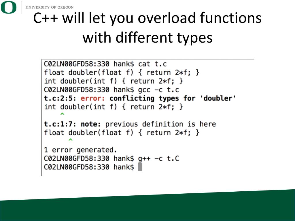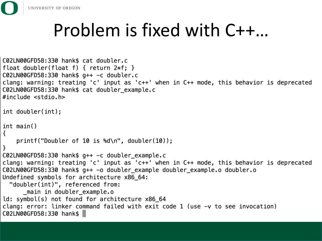 Mangling • Mangling refers to combing information about arguments and “mangling” it with function name. • Way of ensuring that you don’t mix up functions. • Why not return type too? • Causes problems with compiler mismatches • C++ compilers haven’t standardized. • Can’t take library from icpc and combine it with g++.