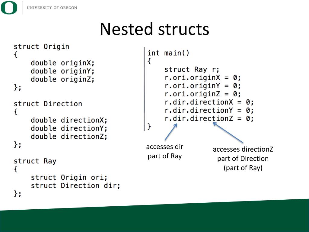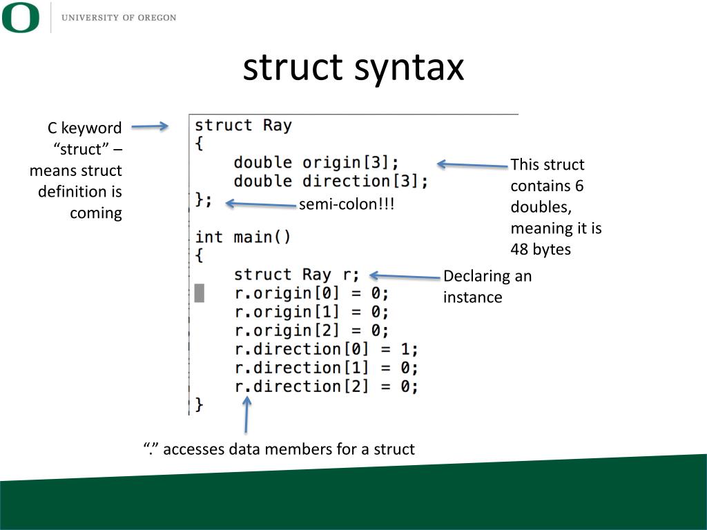 struct syntax “.” accesses data members for a struct C keyword “struct” – means struct definition is coming This struct contains 6 doubles, meaning it is 48 bytes semi-colon!!! Declaring an instance