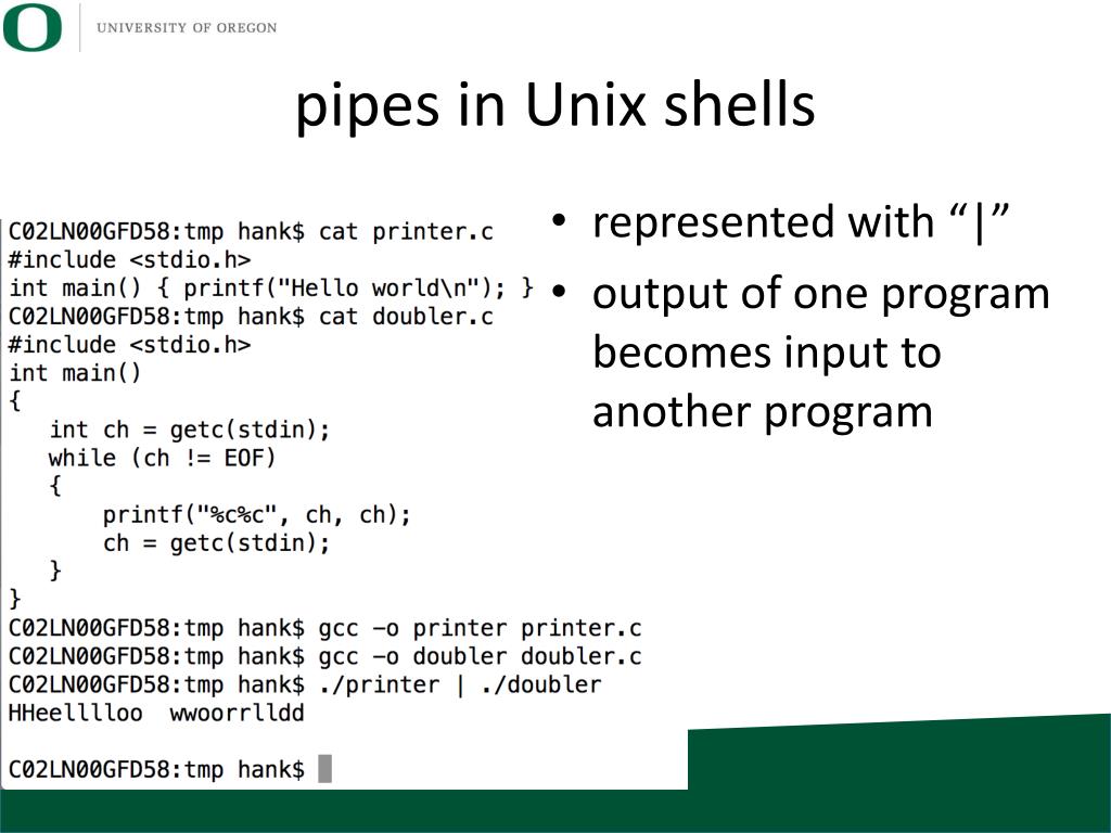 pipes in Unix shells • represented with “|” • output of one program becomes input to another program