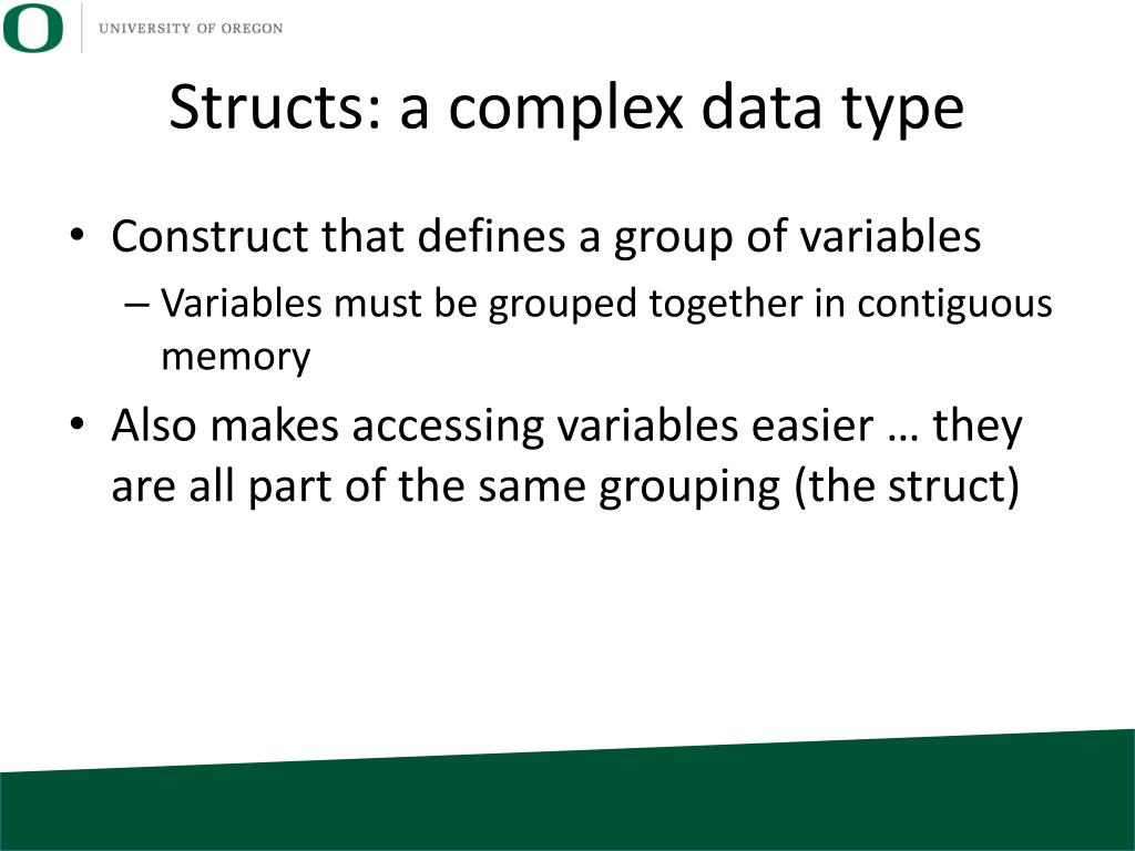 Structs: a complex data type • Construct that defines a group of variables • Variables must be grouped together in contiguous memory • Also makes accessing variables easier … they are all part of the same grouping (the struct)