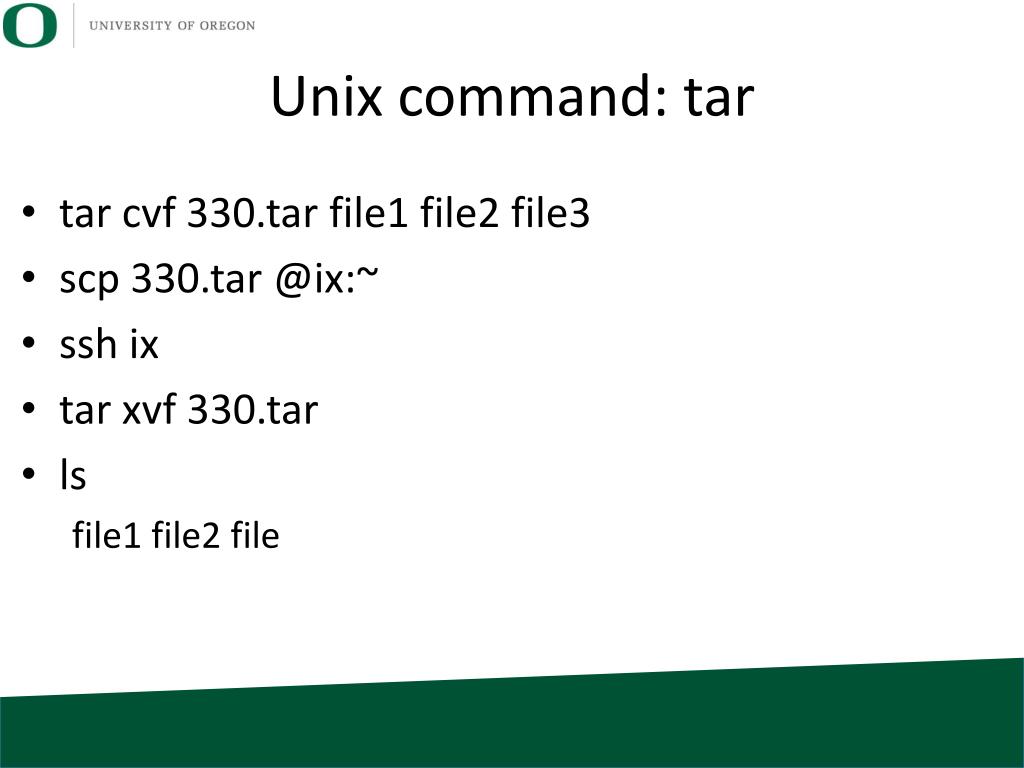 Unix command: tar • tar cvf 330.tar file1 file2 file3 • scp 330.tar @ix:~ • ssh ix • tar xvf 330.tar • ls file1 file2 file