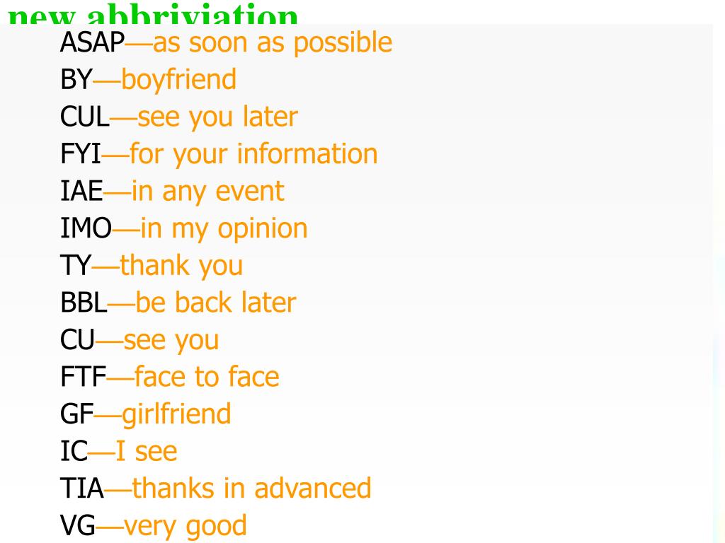 new abbriviation ASAP—as soon as possible BY—boyfriend CUL—see you later FYI—for your information IAE—in any event IMO—in my opinion TY—thank you BBL—be back later CU—see you FTF—face to face GF—girlfriend IC—I see TIA—thanks in advanced VG—very good