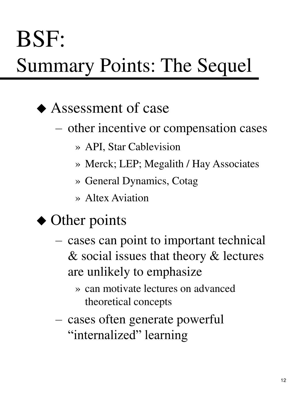 BSF:Summary Points: The Sequel • Assessment of case • other incentive or compensation cases • API, Star Cablevision • Merck; LEP; Megalith / Hay Associates • General Dynamics, Cotag • Altex Aviation • Other points • cases can point to important technical & social issues that theory & lectures are unlikely to emphasize • can motivate lectures on advanced theoretical concepts • cases often generate powerful “internalized” learning