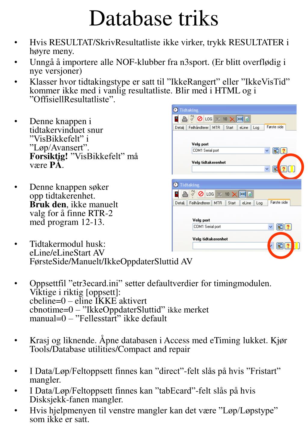 Database triks • Hvis RESULTAT/SkrivResultatliste ikke virker, trykk RESULTATER i høyre meny. • Unngå å importere alle NOF-klubber fra n3sport. (Er blitt overflødig i nye versjoner) • Klasser hvor tidtakingstype er satt til ”IkkeRangert” eller ”IkkeVisTid” kommer ikke med i vanlig resultatliste. Blir med i HTML og i ”OffisiellResultatliste”. • Denne knappen i tidtakervinduet snur”VisBikkefelt” i ”Løp/Avansert”.Forsiktig! ”VisBikkefelt” må være PÅ. • Denne knappen søkeropp tidtakerenhet. Bruk den, ikke manueltvalg for å finne RTR-2med program 12-13. • Tidtakermodul husk:eLine/eLineStart AVFørsteSide/Manuelt/IkkeOppdaterSluttid AV • Oppsettfil ”etr3ecard.ini” setter defaultverdier for timingmodulen. Viktige i riktig [oppsett]:cbeline=0 – eline IKKE aktivertcbnotime=0 – ”IkkeOppdaterSluttid” ikke merketmanual=0 – ”Fellesstart” ikke default • Krasj og liknende. Åpne databasen i Access med eTiming lukket. Kjør Tools/Database utilities/Compact and repair • I Data/Løp/Feltoppsett finnes kan ”direct”-felt slås på hvis ”Fristart” mangler. • I Data/Løp/Feltoppsett finnes kan ”tabEcard”-felt slås på hvis Disksjekk-fanen mangler. • Hvis hjelpmenyen til venstre mangler kan det være ”Løp/Løpstype” som ikke er satt.