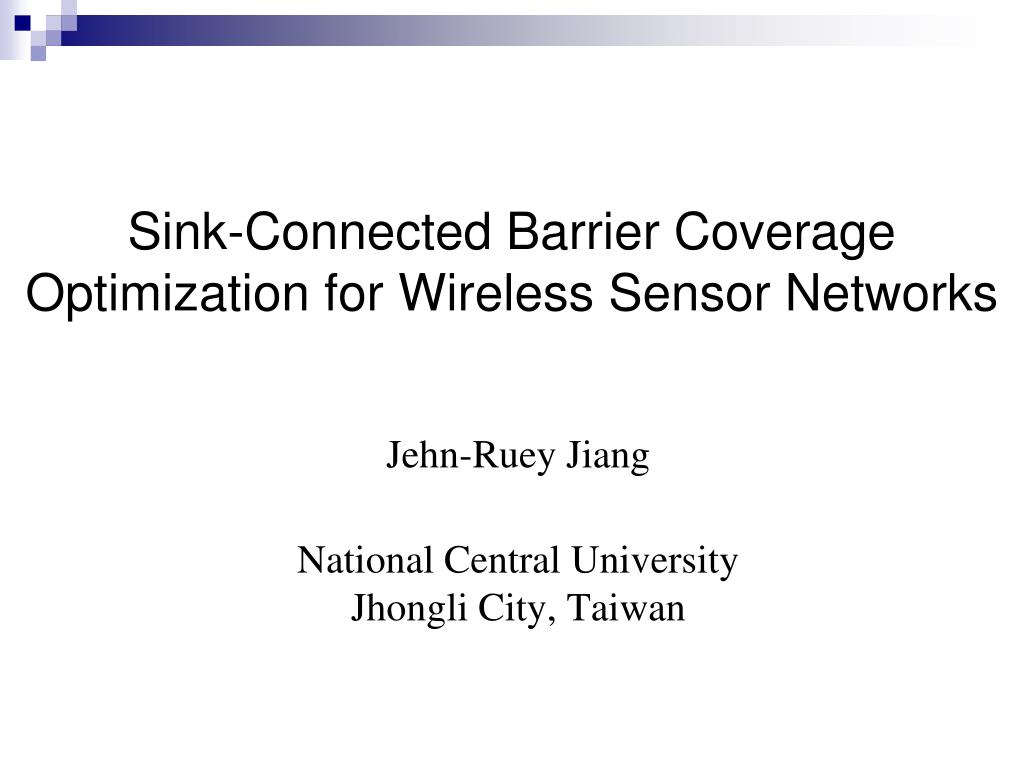 Sink-Connected Barrier Coverage Optimization for Wireless Sensor Networks. Jehn-Ruey Jiang National Central University Jhongli City, Taiwan. Outline. Background Sink-Connected Barrier Coverage Optimization Problem Maximum Flow Minimum Cost Planning Performance Evaluation Conclusion.