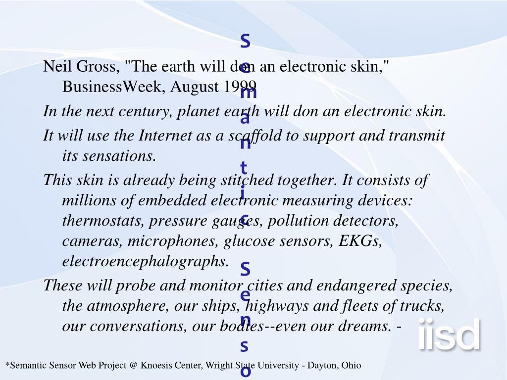 Semantic Sensor Web* Neil Gross, "The earth will don an electronic skin," BusinessWeek, August 1999 In the next century, planet earth will don an electronic skin. It will use the Internet as a scaffold to support and transmit its sensations. This skin is already being stitched together. It consists of millions of embedded electronic measuring devices: thermostats, pressure gauges, pollution detectors, cameras, microphones, glucose sensors, EKGs, electroencephalographs. These will probe and monitor cities and endangered species, the atmosphere, our ships, highways and fleets of trucks, our conversations, our bodies--even our dreams. - *Semantic Sensor Web Project @ Knoesis Center, Wright State University - Dayton, Ohio