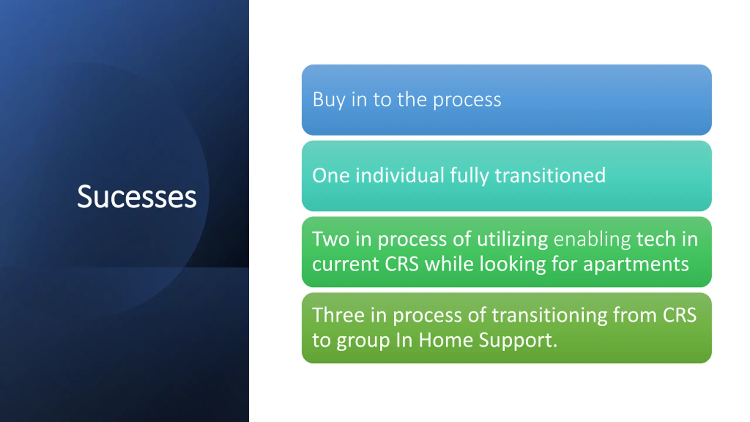 Buy in to the process One individual fully transitioned Sucesses Sucesses Two in process of utilizing enabling tech in current CRS while looking for apartments Three in process of transitioning from CRS to group In Home Support.
