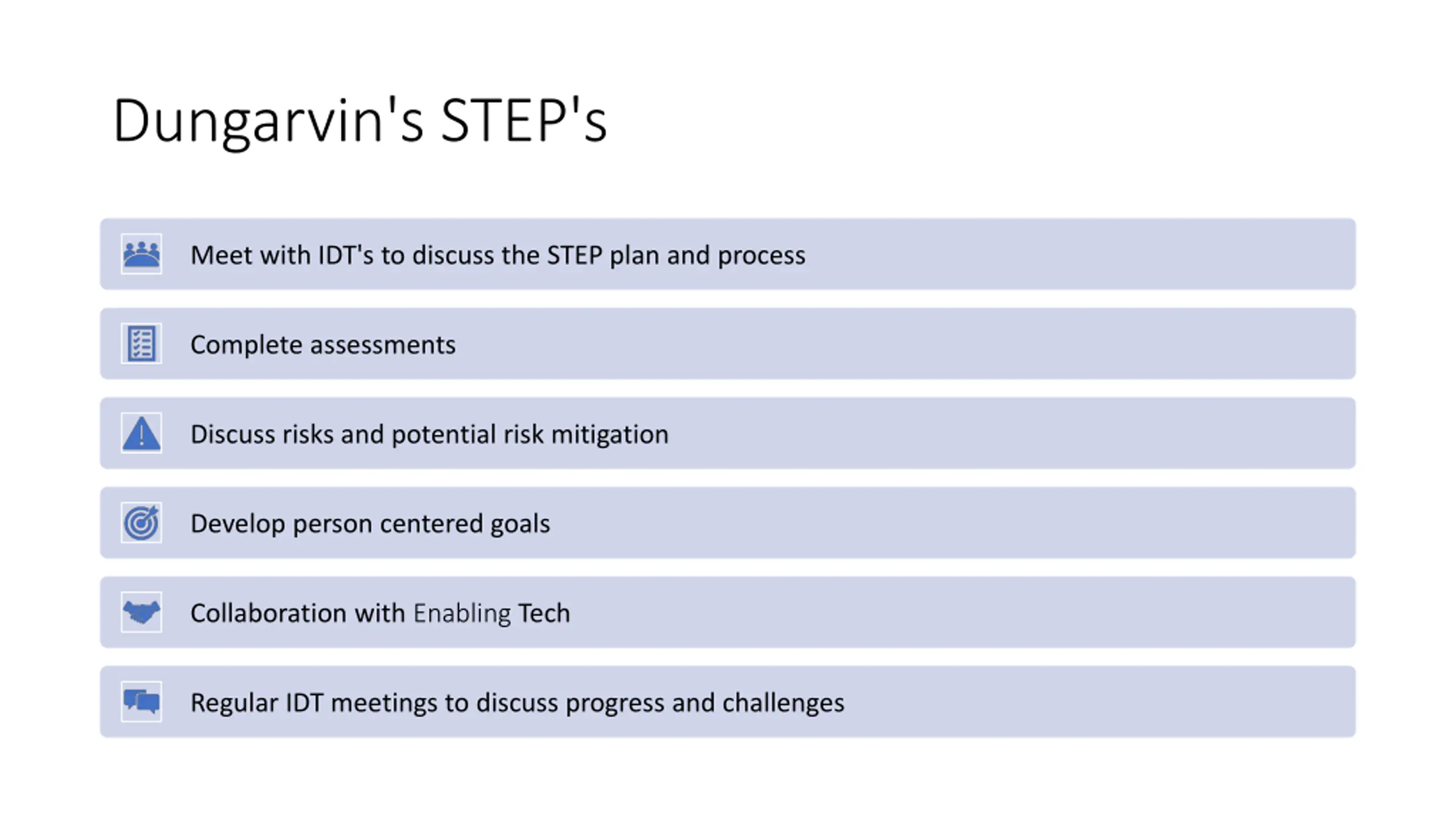 Dungarvin's STEP's Meet with IDT's to discuss the STEP plan and process Complete assessments Discuss risks and potential risk mitigation Develop person centered goals Collaboration with Enabling Tech Regular IDT meetings to discuss progress and challenges