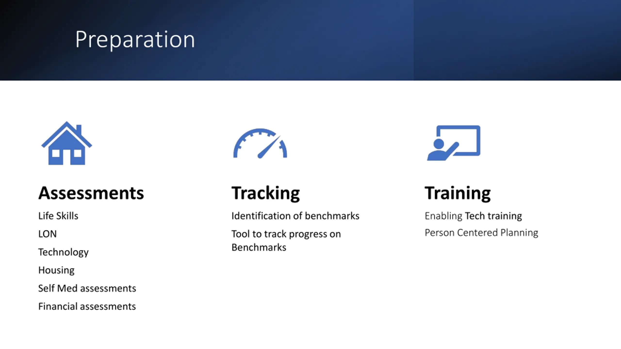 Preparation Assessments Tracking Training Life Skills Identification of benchmarks Enabling Tech training Person Centered Planning LON Tool to track progress on Benchmarks Technology Housing Self Med assessments Financial assessments