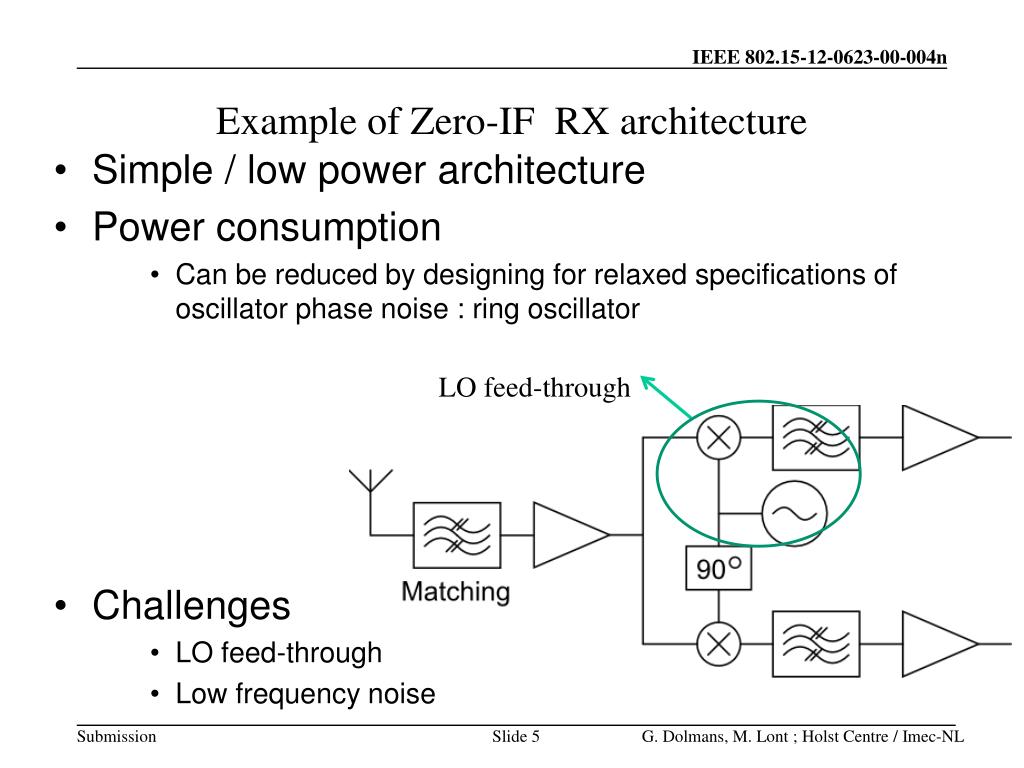 Example of Zero-IF RX architecture • Simple / low power architecture • Power consumption • Can be reduced by designing for relaxed specifications of oscillator phase noise : ring oscillator • Challenges • LO feed-through • Low frequency noise LO feed-through G. Dolmans, M. Lont ; Holst Centre / Imec-NL
