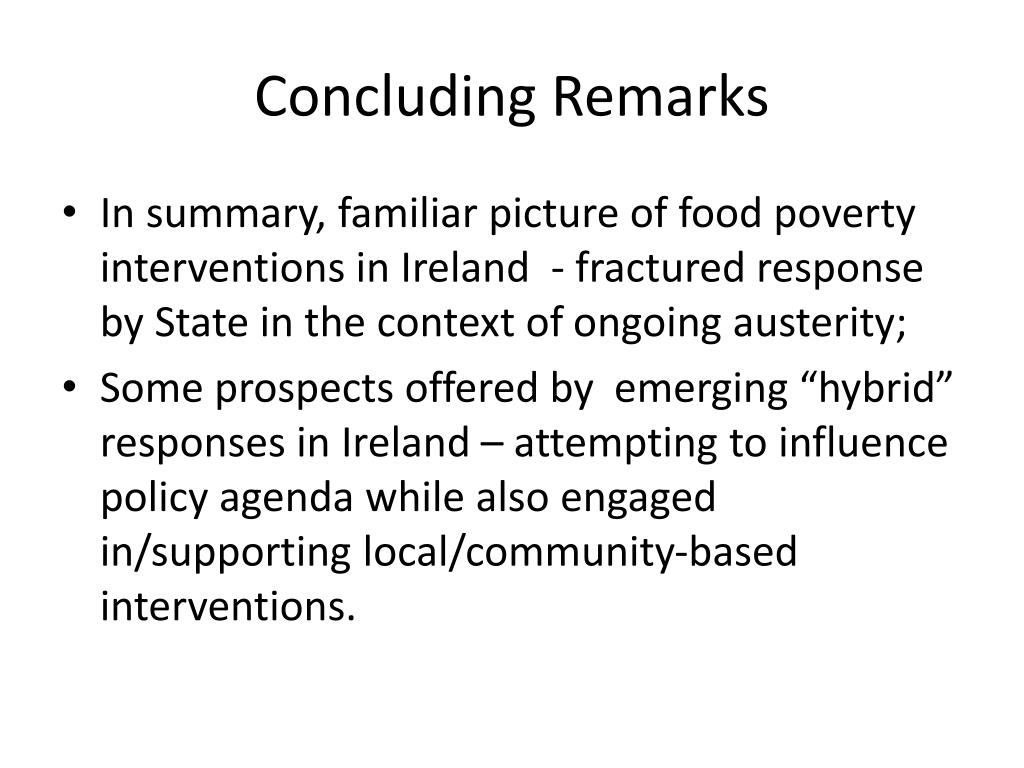 Concluding Remarks • In summary, familiar picture of food poverty interventions in Ireland - fractured response by State in the context of ongoing austerity; • Some prospects offered by emerging “hybrid” responses in Ireland – attempting to influence policy agenda while also engaged in/supporting local/community-based interventions.