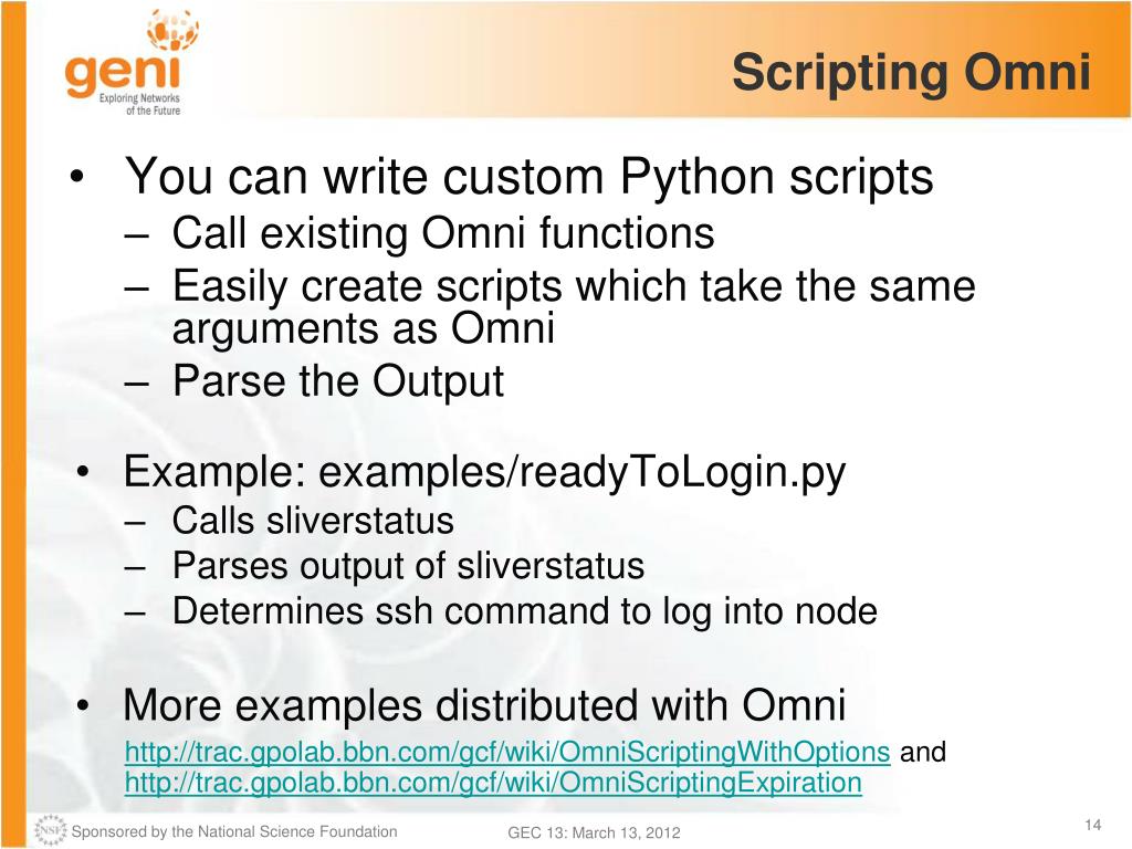 Scripting Omni • You can write custom Python scripts • Call existing Omni functions • Easily create scripts which take the same arguments as Omni • Parse the Output • Example: examples/readyToLogin.py • Calls sliverstatus • Parses output of sliverstatus • Determines ssh command to log into node • More examples distributed with Omni http://trac.gpolab.bbn.com/gcf/wiki/OmniScriptingWithOptions and http://trac.gpolab.bbn.com/gcf/wiki/OmniScriptingExpiration