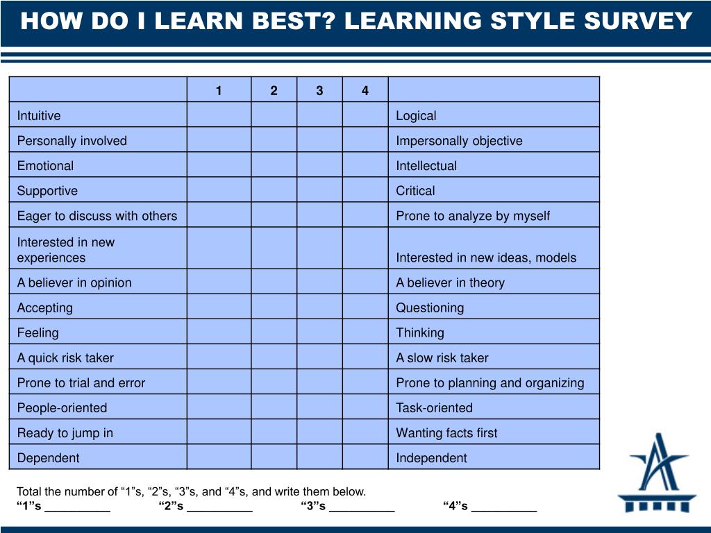 HOW DO I LEARN BEST? LEARNING STYLE SURVEY Total the number of “1”s, “2”s, “3”s, and “4”s, and write them below. “1”s __________ “2”s __________ “3”s __________ “4”s __________