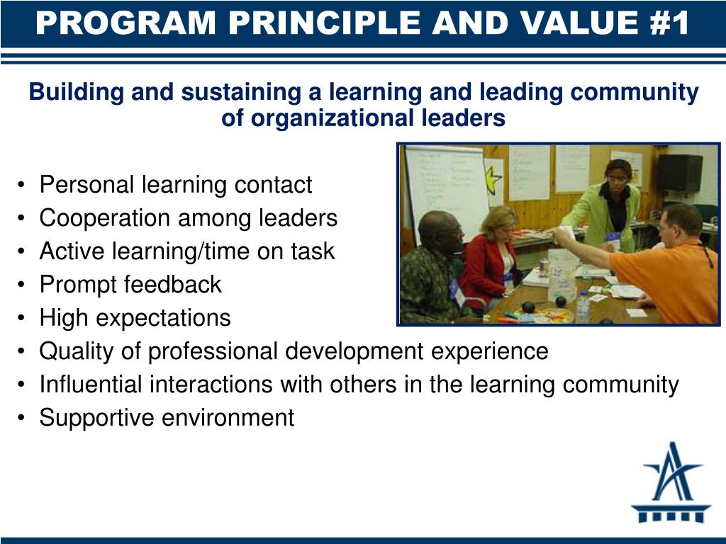 PROGRAM PRINCIPLE AND VALUE #1 Building and sustaining a learning and leading community of organizational leaders Personal learning contact Cooperation among leaders Active learning/time on task Prompt feedback High expectations Quality of professional development experience Influential interactions with others in the learning community Supportive environment