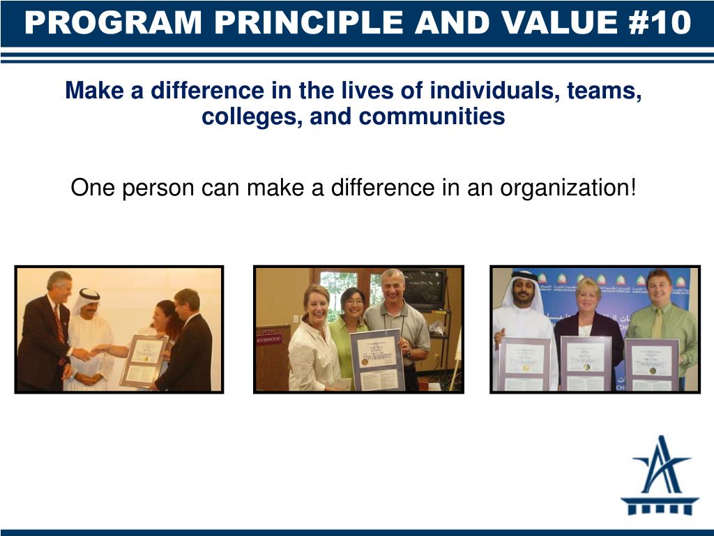 Make a difference in the lives of individuals, teams, colleges, and communities One person can make a difference in an organization! PROGRAM PRINCIPLE AND VALUE #10
