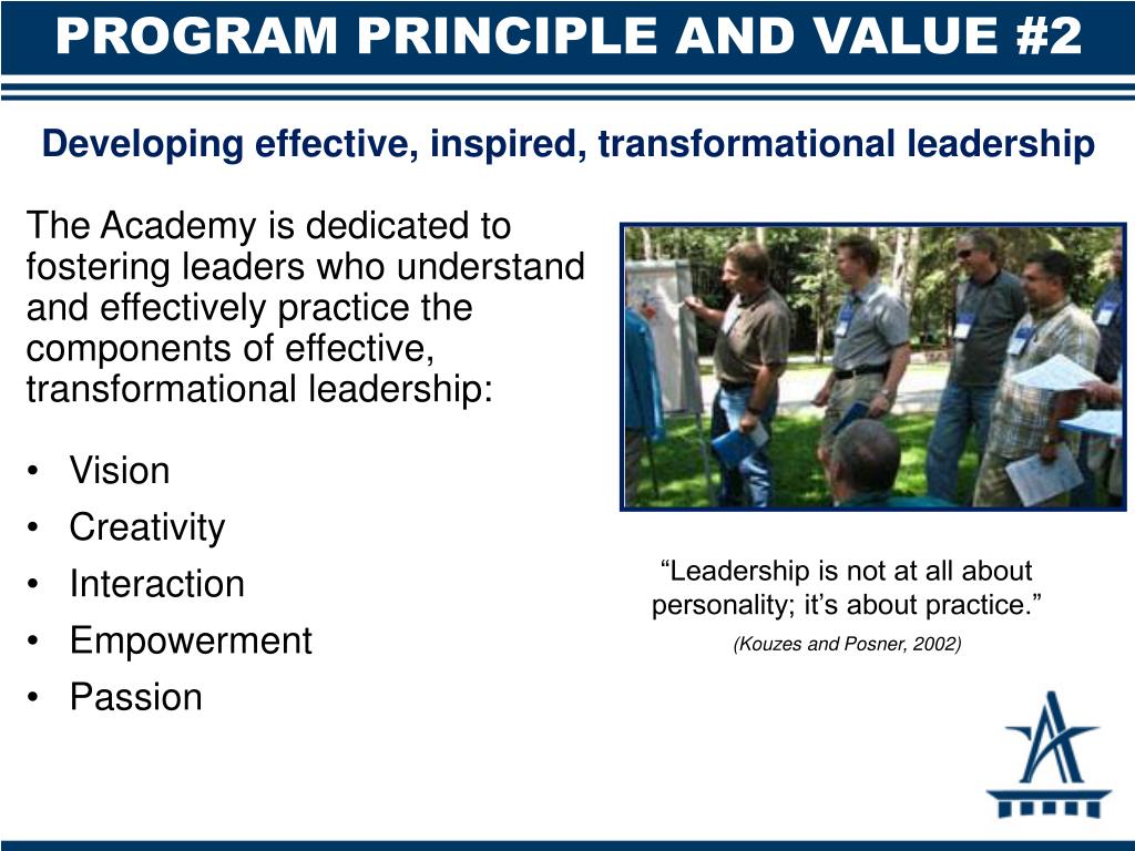 PROGRAM PRINCIPLE AND VALUE #2 Developing effective, inspired, transformational leadership The Academy is dedicated to fostering leaders who understand and effectively practice the components of effective, transformational leadership: Vision Creativity Interaction Empowerment Passion “Leadership is not at all about personality; it’s about practice.” (Kouzes and Posner, 2002)
