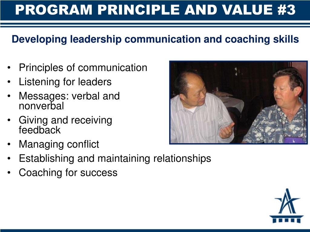 PROGRAM PRINCIPLE AND VALUE #3 Developing leadership communication and coaching skills Principles of communication Listening for leaders Messages: verbal and nonverbal Giving and receiving feedback Managing conflict Establishing and maintaining relationships Coaching for success