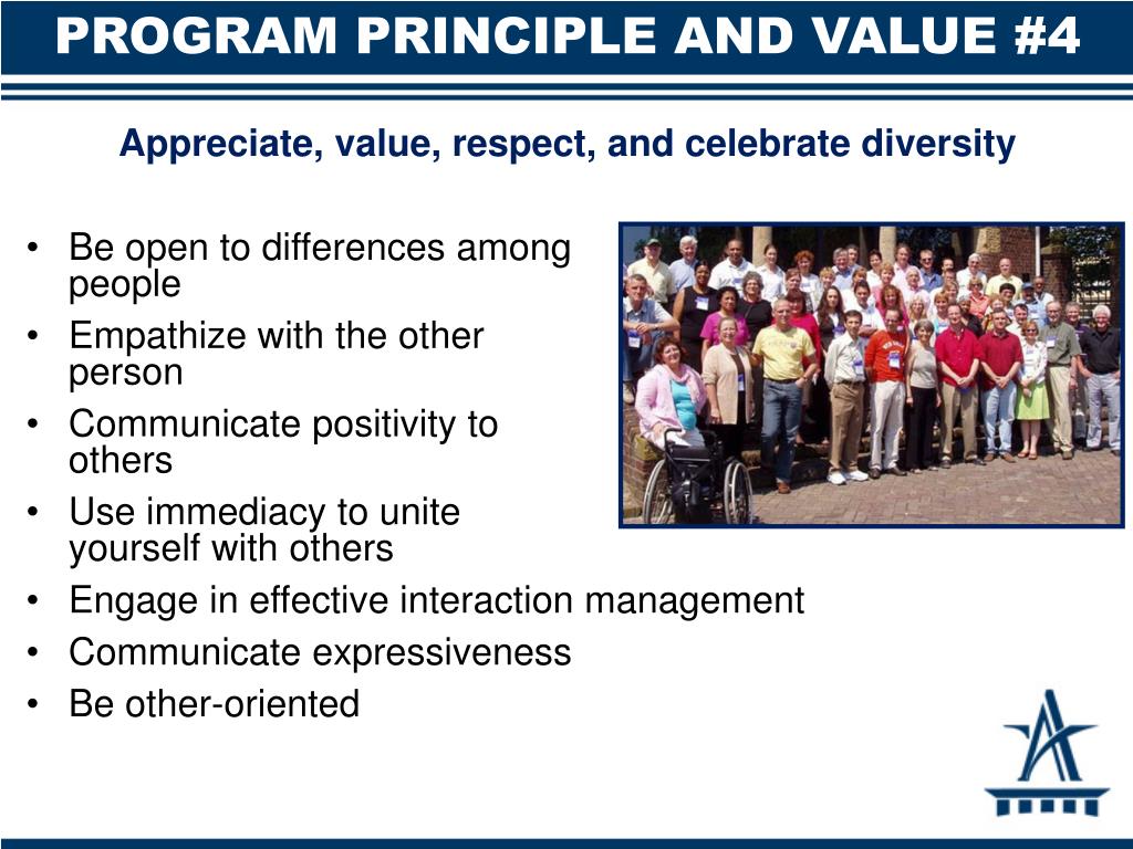 PROGRAM PRINCIPLE AND VALUE #4 Appreciate, value, respect, and celebrate diversity Be open to differences among people Empathize with the other person Communicate positivity to others Use immediacy to unite yourself with others Engage in effective interaction management Communicate expressiveness Be other-oriented