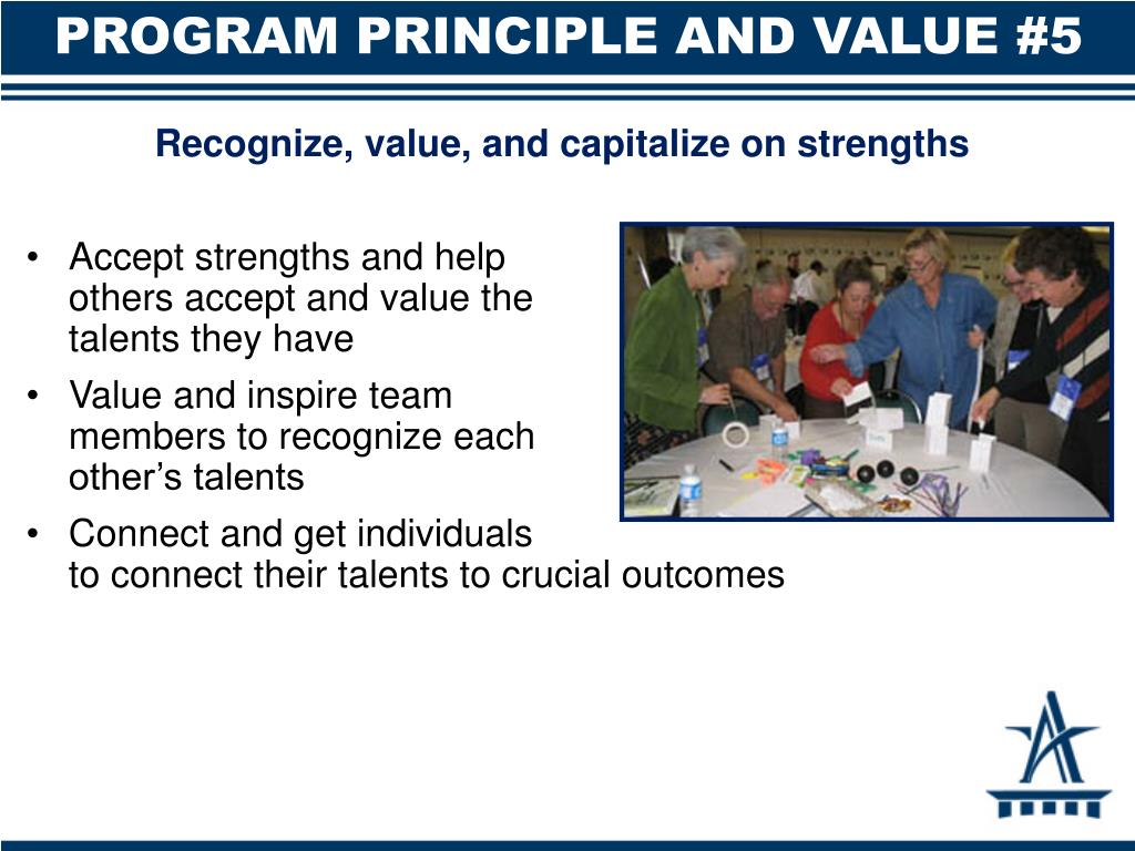 PROGRAM PRINCIPLE AND VALUE #5 Recognize, value, and capitalize on strengths Accept strengths and help others accept and value the talents they have Value and inspire team members to recognize each other’s talents Connect and get individuals to connect their talents to crucial outcomes