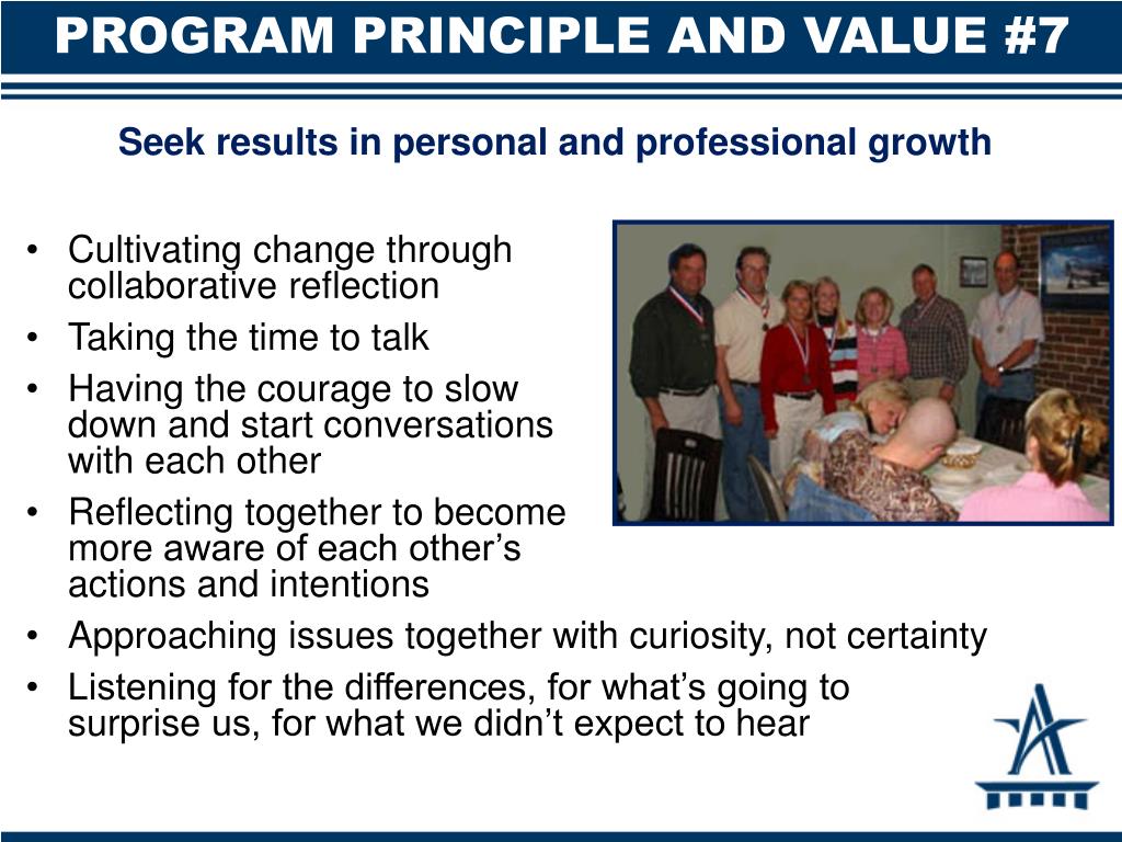 PROGRAM PRINCIPLE AND VALUE #7 Seek results in personal and professional growth Cultivating change through collaborative reflection Taking the time to talk Having the courage to slow down and start conversations with each other Reflecting together to become more aware of each other’s actions and intentions Approaching issues together with curiosity, not certainty Listening for the differences, for what’s going to surprise us, for what we didn’t expect to hear