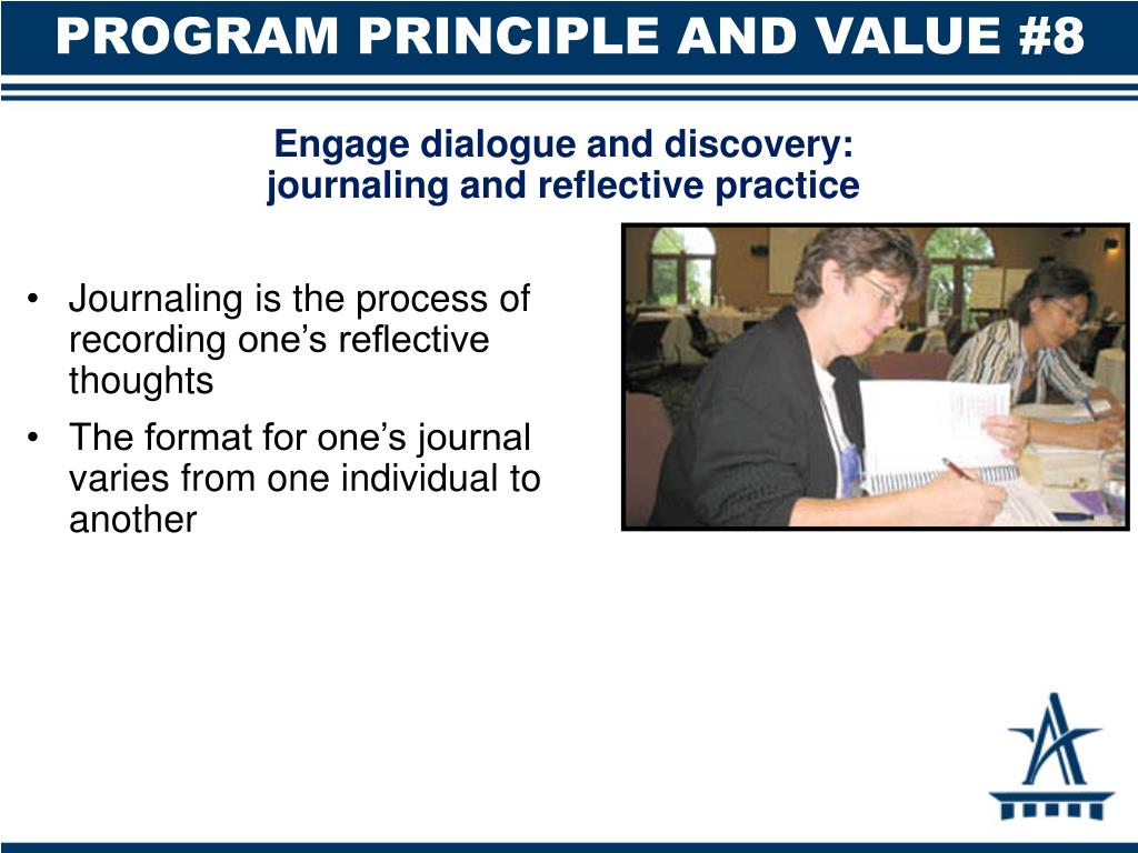 PROGRAM PRINCIPLE AND VALUE #8 Engage dialogue and discovery: journaling and reflective practice Journaling is the process of recording one’s reflective thoughts The format for one’s journal varies from one individual to another