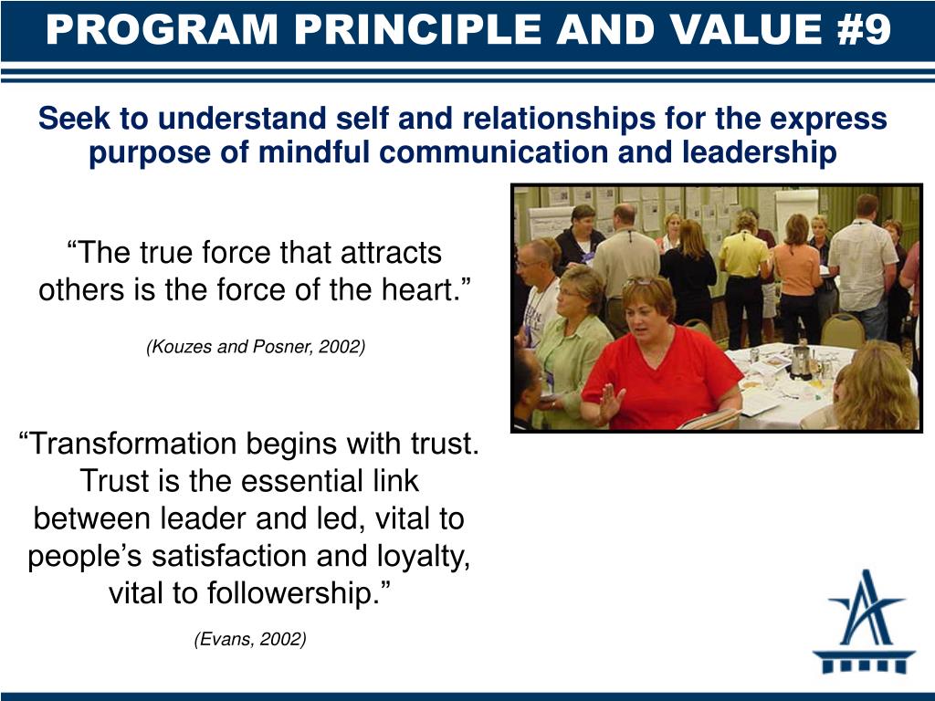 PROGRAM PRINCIPLE AND VALUE #9 “The true force that attracts others is the force of the heart.” (Kouzes and Posner, 2002) Seek to understand self and relationships for the express purpose of mindful communication and leadership “Transformation begins with trust. Trust is the essential link between leader and led, vital to people’s satisfaction and loyalty, vital to followership.” (Evans, 2002)