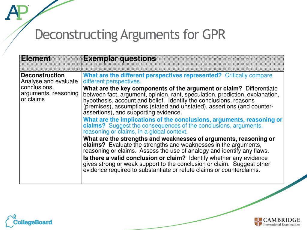 Taking a step back… • Deconstruction for GPR is NOT JUST Critical Thinking. • It also requires students to take a step back, weigh up the range of perspectives and their broader implications.