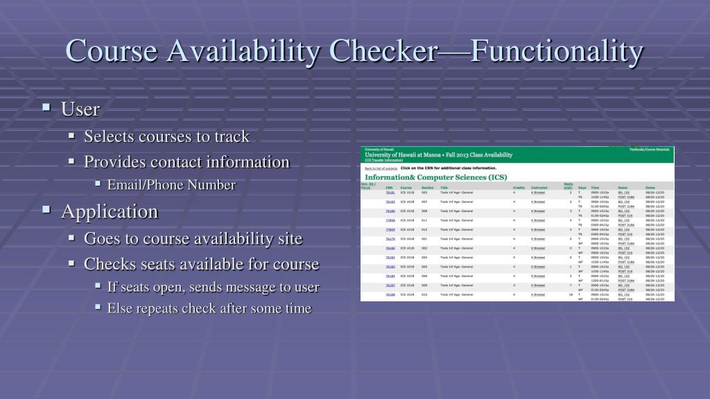 Project Proposals. Hansen Cheng Branden Ogata ICS 665. Course Availability Checker—Functionality. User Selects courses to track Provides contact information Email/Phone Number Application Goes to course availability site Checks seats available for course