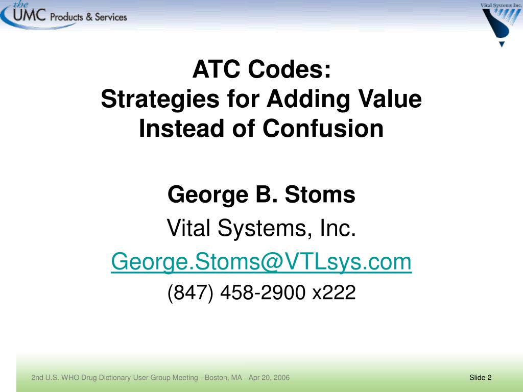 2 ND U.S. WHO Drug Dictionary User Group Meeting. Boston, MA April 20, 2006. ATC Codes: Strategies for Adding Value Instead of Confusion. George B. Stoms Vital Systems, Inc. George.Stoms@VTLsys.com (847) 458-2900 x222. Presentation Overview. ATC classifications – quick primer