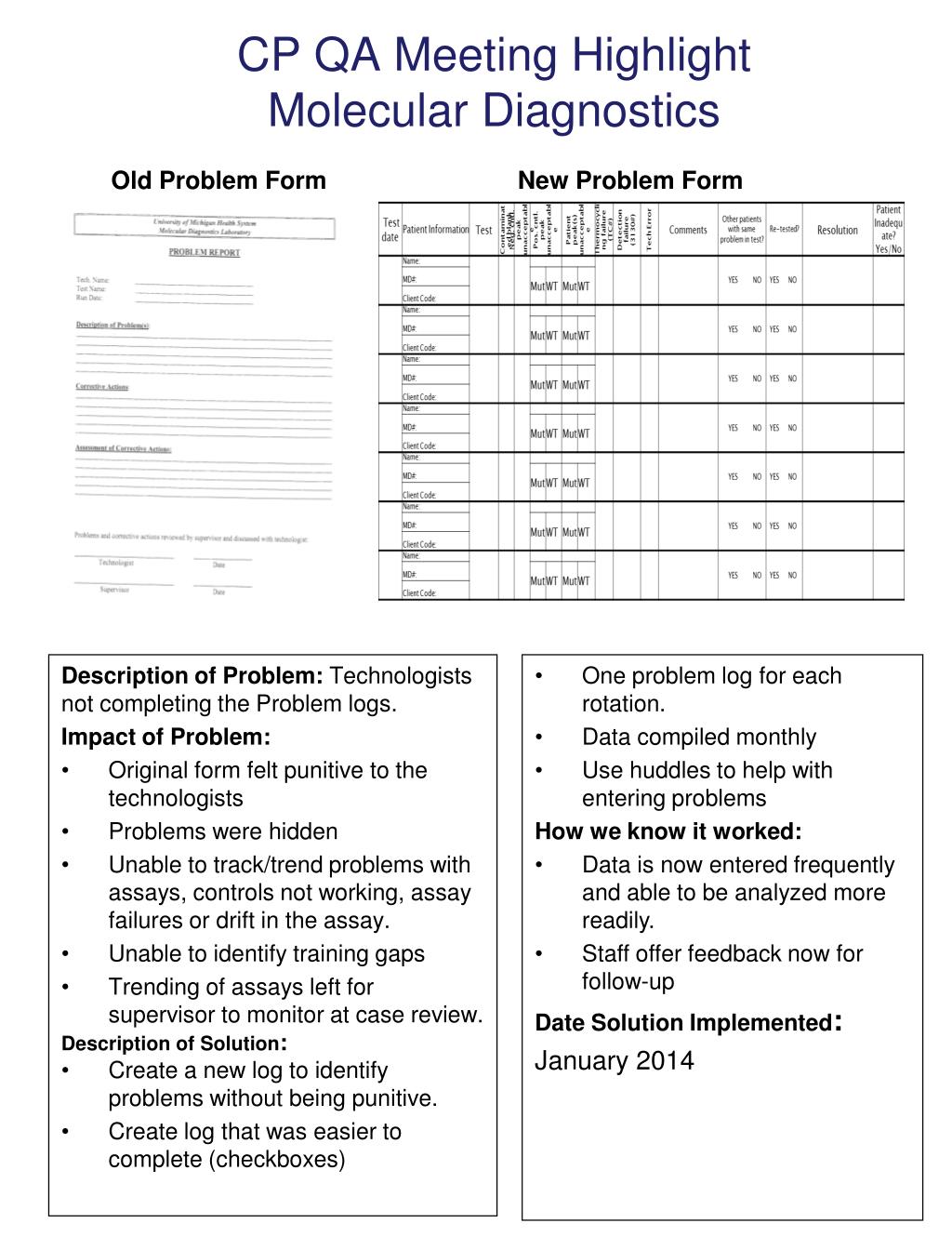 CP QA Meeting HighlightMolecular Diagnostics Old Problem Form New Problem Form Description of Problem: Technologists not completing the Problem logs. Impact of Problem: • Original form felt punitive to the technologists • Problems were hidden • Unable to track/trend problems with assays, controls not working, assay failures or drift in the assay. • Unable to identify training gaps • Trending of assays left for supervisor to monitor at case review. Description of Solution: • Create a new log to identify problems without being punitive. • Create log that was easier to complete (checkboxes) • One problem log for each rotation. • Data compiled monthly • Use huddles to help with entering problems How we know it worked: • Data is now entered frequently and able to be analyzed more readily. • Staff offer feedback now for follow-up Date Solution Implemented: January 2014