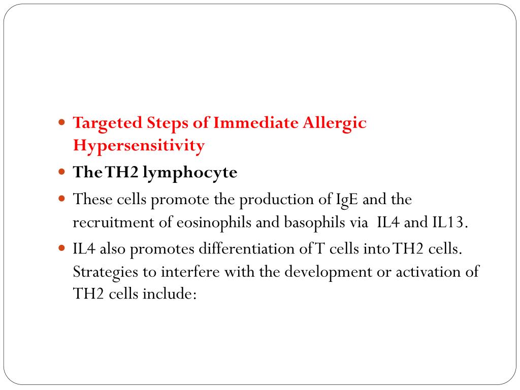 Targeted Steps of Immediate Allergic Hypersensitivity • The TH2 lymphocyte • These cells promote the production of IgE and the recruitment of eosinophils and basophils via IL4 and IL13. • IL4 also promotes differentiation of T cells into TH2 cells. Strategies to interfere with the development or activation of TH2 cells include:
