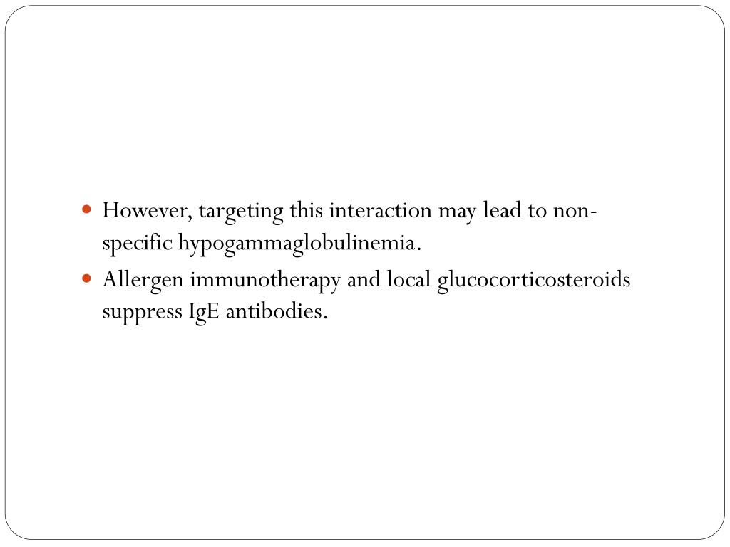 However, targeting this interaction may lead to non-specific hypogammaglobulinemia. • Allergen immunotherapy and local glucocorticosteroids suppress IgE antibodies.