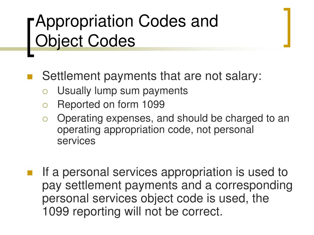 Appropriation Codes and Object Codes • Settlement payments that are not salary: • Usually lump sum payments • Reported on form 1099 • Operating expenses, and should be charged to an operating appropriation code, not personal services • If a personal services appropriation is used to pay settlement payments and a corresponding personal services object code is used, the 1099 reporting will not be correct.