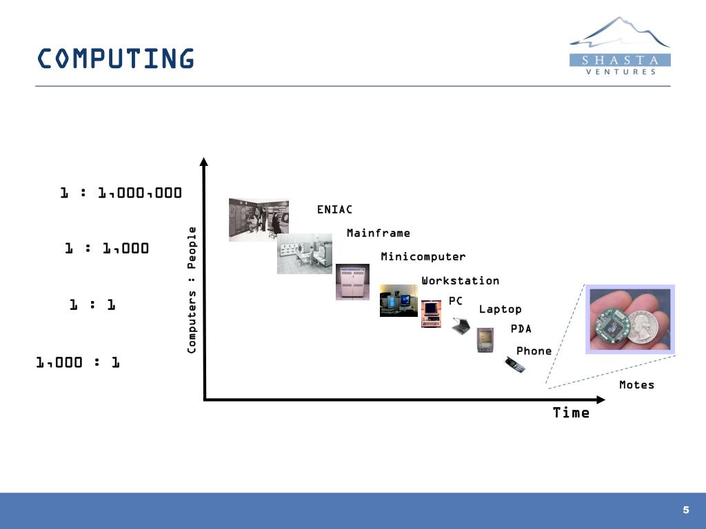 COMPUTING 1 : 1,000,000 ENIAC Mainframe 1 : 1,000 Minicomputer Workstation Computers : People PC 1 : 1 Laptop PDA Phone 1,000 : 1 Motes Time