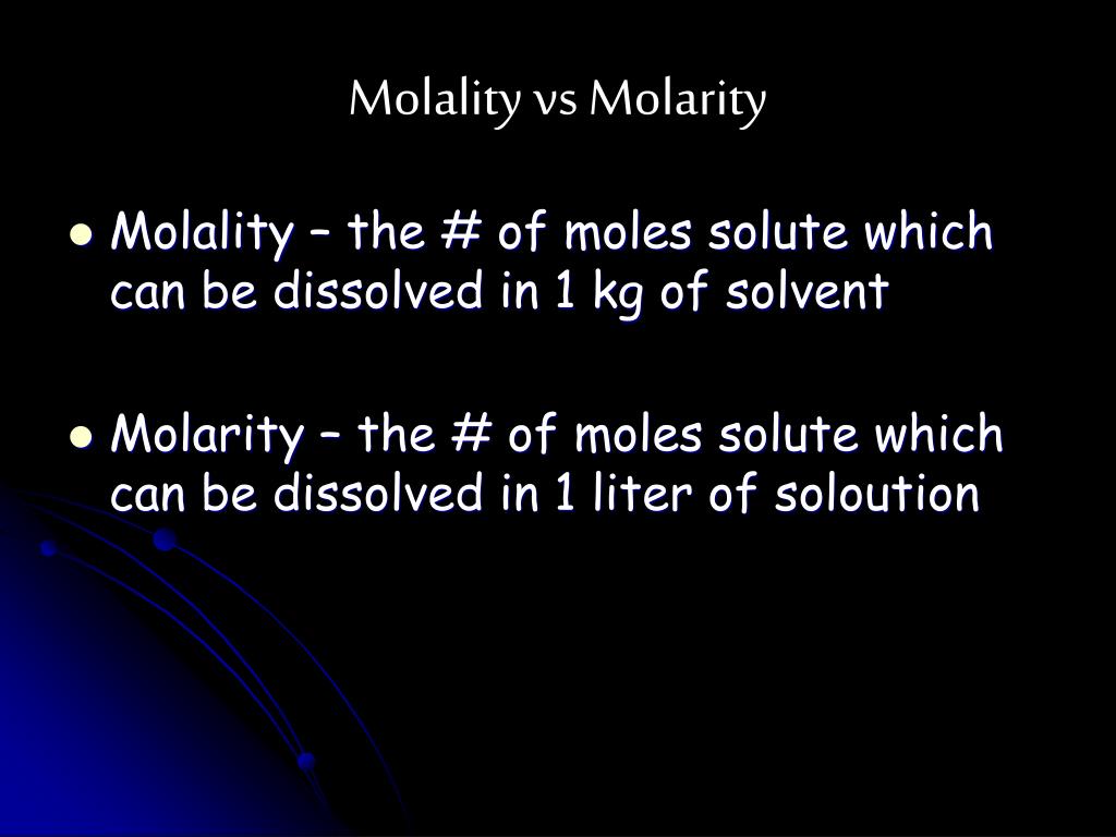 Molality vs Molarity • Molality – the # of moles solute which can be dissolved in 1 kg of solvent • Molarity – the # of moles solute which can be dissolved in 1 liter of soloution
