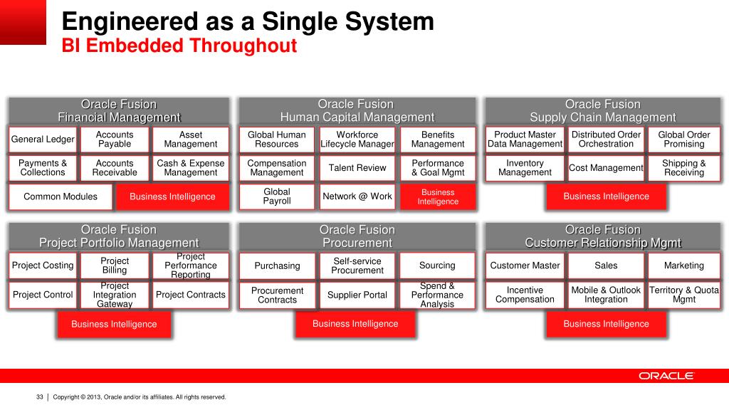 Engineered as a Single SystemBI Embedded Throughout Oracle Fusion Human Capital Management Oracle FusionFinancial Management Oracle FusionSupply Chain Management Product Master Data Management Distributed Order Orchestration General Ledger Accounts Payable Global Order Promising Asset Management Global Human Resources Workforce Lifecycle Manager Benefits Management Inventory Management Payments &Collections Cost Management Shipping & Receiving Accounts Receivable Cash & Expense Management Compensation Management Talent Review Performance & Goal Mgmt Common Modules Business Intelligence Business Intelligence GlobalPayroll Network @ Work Business Intelligence Oracle FusionProject Portfolio Management Oracle FusionProcurement Oracle FusionCustomer Relationship Mgmt Sourcing Project Costing ProjectBilling Project Performance Reporting Customer Master Sales Marketing Purchasing Self-service Procurement Project Contracts IncentiveCompensation Mobile & Outlook Integration Territory & Quota Mgmt Project Control Supplier Portal Spend & Performance Analysis Project Integration Gateway Procurement Contracts Business Intelligence Business Intelligence Business Intelligence