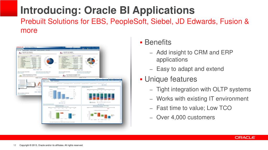 Introducing: Oracle BI Applications Prebuilt Solutions for EBS, PeopleSoft, Siebel, JD Edwards, Fusion & more • Benefits • Add insight to CRM and ERP applications • Easy to adapt and extend • Unique features • Tight integration with OLTP systems • Works with existing IT environment • Fast time to value; Low TCO • Over 4,000 customers