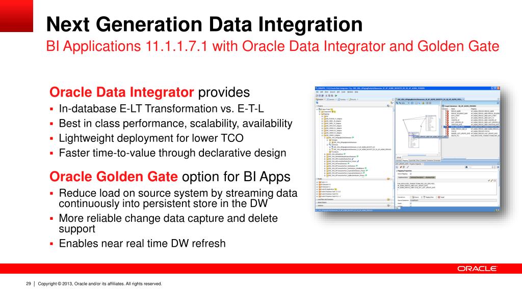 Next Generation Data Integration BI Applications 11.1.1.7.1 with Oracle Data Integrator and Golden Gate Oracle Data Integrator provides • In-database E-LT Transformation vs. E-T-L • Best in class performance, scalability, availability • Lightweight deployment for lower TCO • Faster time-to-value through declarative design Oracle Golden Gate option for BI Apps • Reduce load on source system by streaming data continuously into persistent store in the DW • More reliable change data capture and delete support • Enables near real time DW refresh