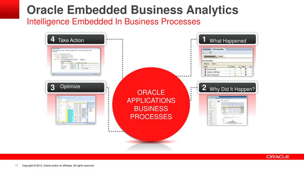 Oracle Embedded Business Analytics Intelligence Embedded In Business Processes ORACLE APPLICATIONS BUSINESS PROCESSES 1 4 Take Action What Happened 3 2 Optimize Why Did It Happen?