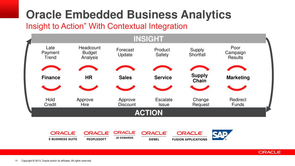 Oracle Embedded Business Analytics Insight to Action” With Contextual Integration INSIGHT LatePaymentTrend HeadcountBudgetAnalysis PoorCampaignResults ForecastUpdate ProductSafety SupplyShortfall SupplyChain Finance HR Sales Service Marketing HoldCredit ApproveHire ApproveDiscount EscalateIssue ChangeRequest RedirectFunds ACTION