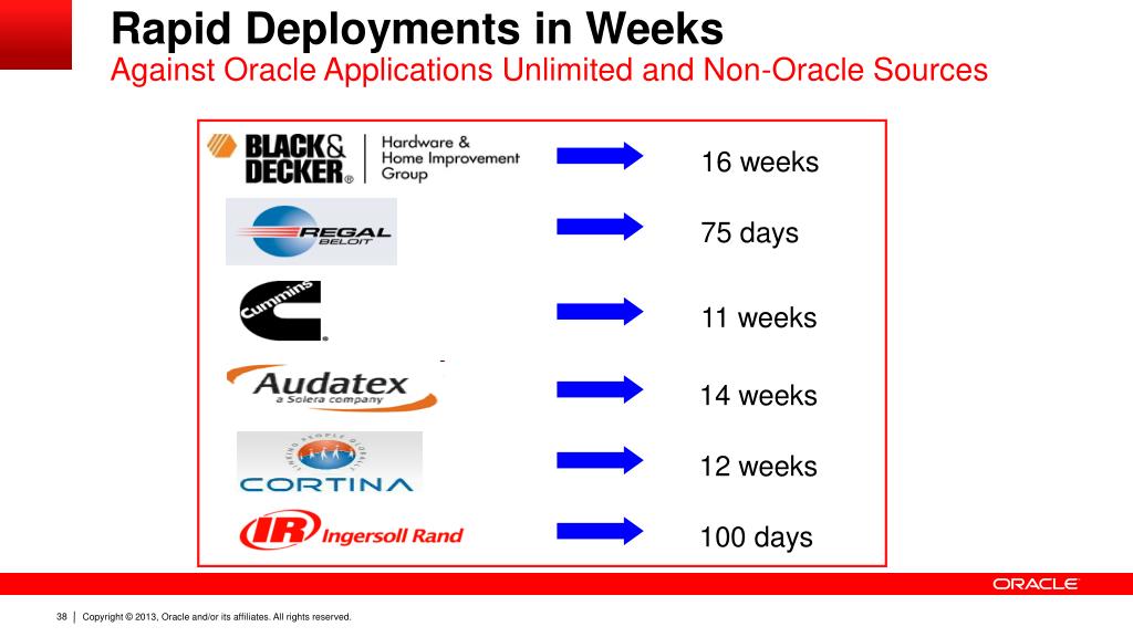 Rapid Deployments in WeeksAgainst Oracle Applications Unlimited and Non-Oracle Sources 16 weeks 75 days 11 weeks 14 weeks 12 weeks 100 days