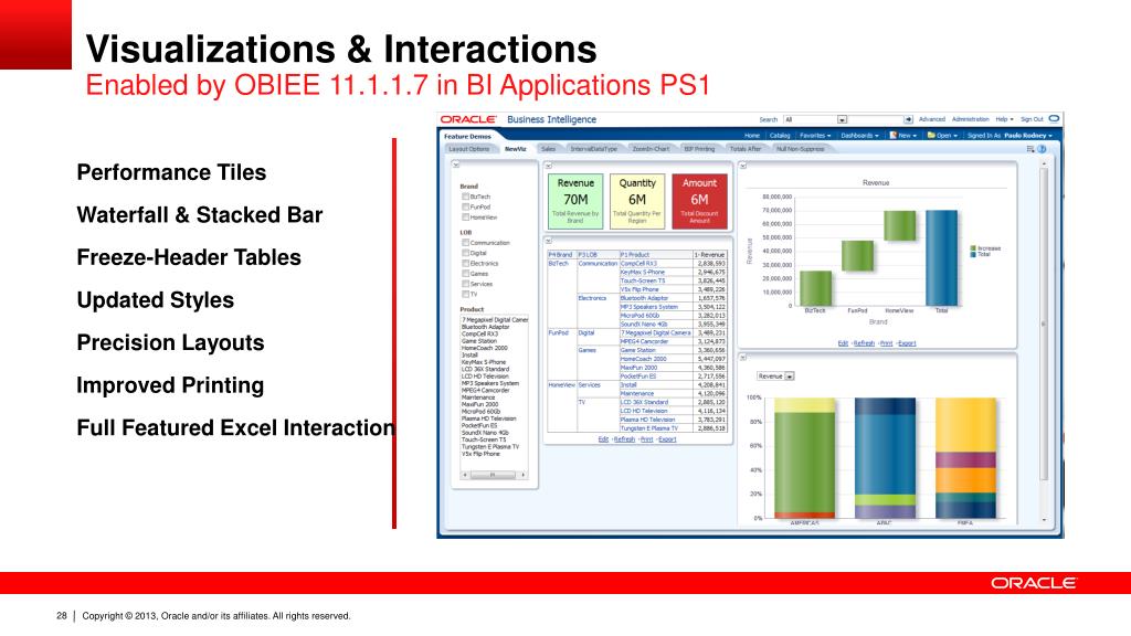 Visualizations & Interactions Enabled by OBIEE 11.1.1.7 in BI Applications PS1 Performance Tiles Waterfall & Stacked Bar Freeze-Header Tables Updated Styles Precision Layouts Improved Printing Full Featured Excel Interaction