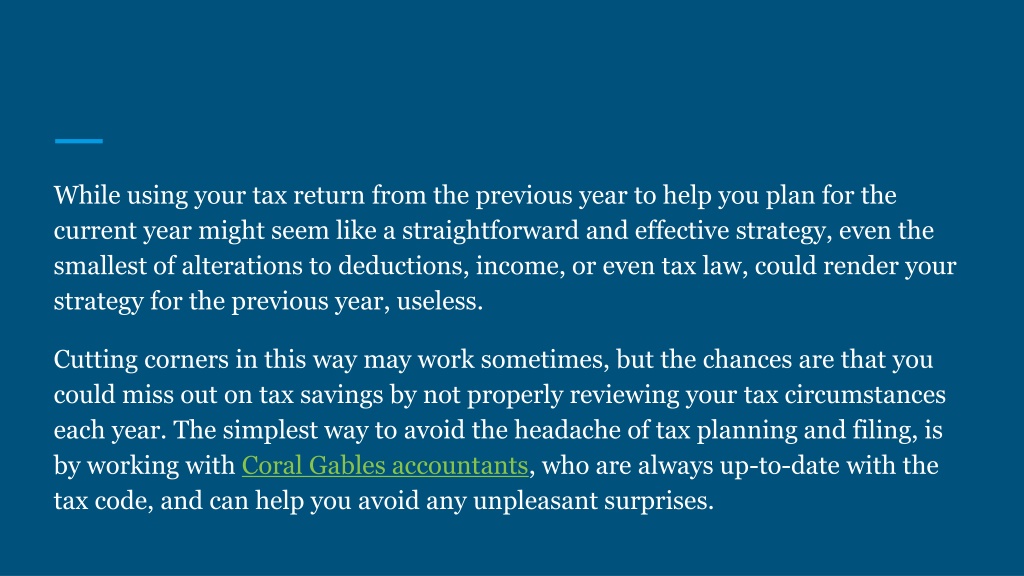 6. While using your tax return from the previous year to help you plan for the current year might seem like a straightforward and effective strategy, even the smallest of alterations to deductions, income, or even tax law, could render your strategy for the previous year, useless. Cutting corners in this way may work sometimes, but the chances are that you could miss out on tax savings by not properly reviewing your tax circumstances each year. The simplest way to avoid the headache of tax planning and filing, is by working with Coral Gables accountants, who are always up-to-date with the tax code, and can help you avoid any unpleasant surprises.