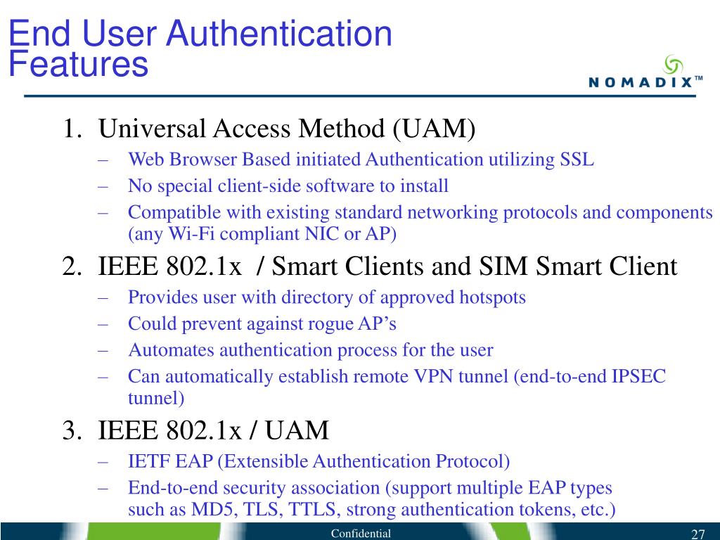 End User AuthenticationFeatures • Universal Access Method (UAM) • Web Browser Based initiated Authentication utilizing SSL • No special client-side software to install • Compatible with existing standard networking protocols and components (any Wi-Fi compliant NIC or AP) • IEEE 802.1x / Smart Clients and SIM Smart Client • Provides user with directory of approved hotspots • Could prevent against rogue AP’s • Automates authentication process for the user • Can automatically establish remote VPN tunnel (end-to-end IPSEC tunnel) • IEEE 802.1x / UAM • IETF EAP (Extensible Authentication Protocol) • End-to-end security association (support multiple EAP types such as MD5, TLS, TTLS, strong authentication tokens, etc.)