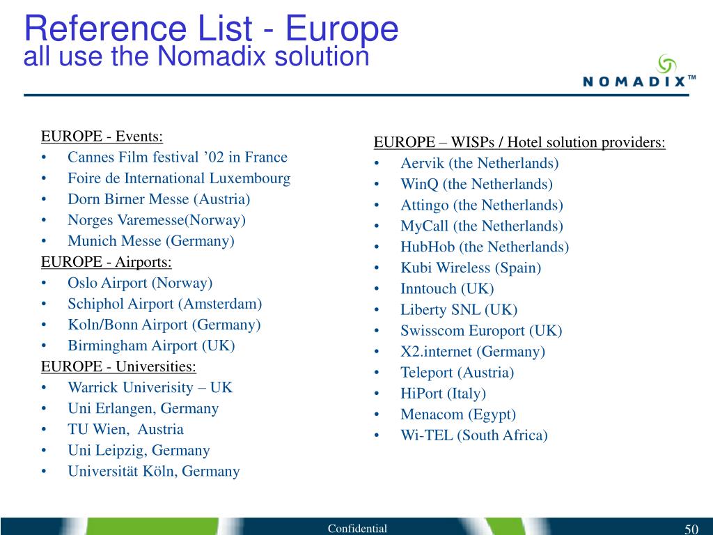 Reference List - Europeall use the Nomadix solution EUROPE - Events: • Cannes Film festival ’02 in France • Foire de International Luxembourg • Dorn Birner Messe (Austria) • Norges Varemesse(Norway) • Munich Messe (Germany) EUROPE - Airports: • Oslo Airport (Norway) • Schiphol Airport (Amsterdam) • Koln/Bonn Airport (Germany) • Birmingham Airport (UK) EUROPE - Universities: • Warrick Univerisity – UK • Uni Erlangen, Germany • TU Wien, Austria • Uni Leipzig, Germany • Universität Köln, Germany EUROPE – WISPs / Hotel solution providers: • Aervik (the Netherlands) • WinQ (the Netherlands) • Attingo (the Netherlands) • MyCall (the Netherlands) • HubHob (the Netherlands) • Kubi Wireless (Spain) • Inntouch (UK) • Liberty SNL (UK) • Swisscom Europort (UK) • X2.internet (Germany) • Teleport (Austria) • HiPort (Italy) • Menacom (Egypt) • Wi-TEL (South Africa)